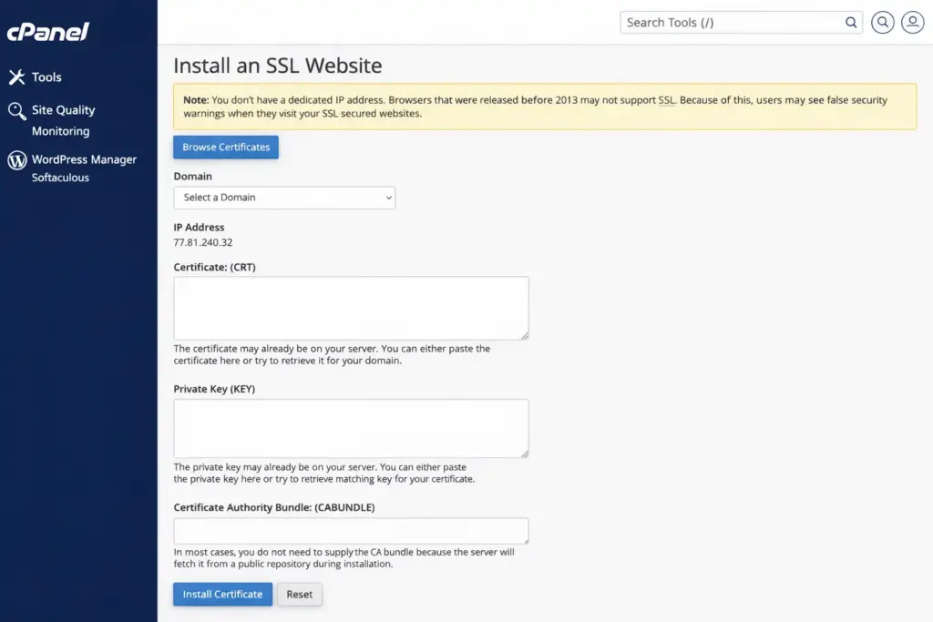 SSL encrypts the connection between your website server and your visitors’ browsers. Once SSL is enabled, your site will use HTTPS instead of HTTP, and a small padlock icon will appear in the browser address bar.